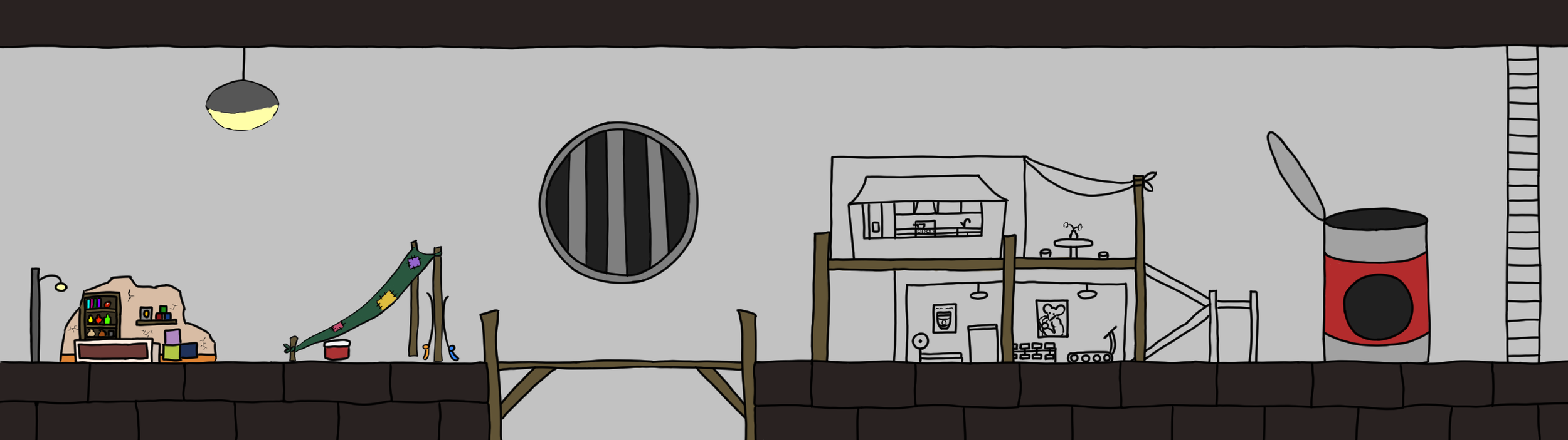 Originally, the city was going to be a 2D environment. Some minigames would be found in the city, while others would be found in the home. The ladder to the right would take you to a maze where you would learn more about the world. This was eventually scrapped for what we have now. Some of these assets were reused in the final version of the sewer city.
