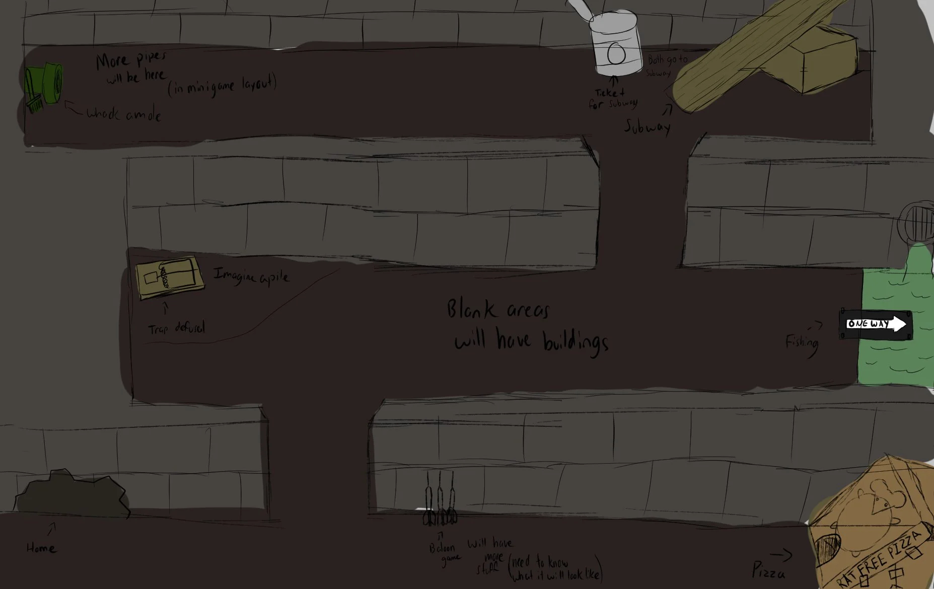 This is a sketch of the sewer city and it’s layout. A few things have changed since the creation of this sketch, such as the can building not being in the game as well as fishing and bomb popping minigame looking slightly different.